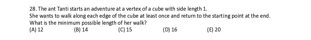 Q28. The ant Tanti starts a a n adventur e at a verte x x of a cube w w ith side len g g th 1. She wants t t o walk alon g g each edge o o f the cube a a t least onc e e and return to the starti n ng point at t he end. What is the minimum p ossible leng t t h of her wa l l k?