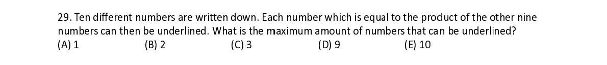 Q29. Ten diff e e rent numb e e rs are writt e e n down. Ea c c h number w w hich is equ a a l to the pro d d uct of the o o ther nine numbers c a a n then be u n n derlined. W W hat is the m m aximum am ount of nu m m bers that ca n be underli ned?