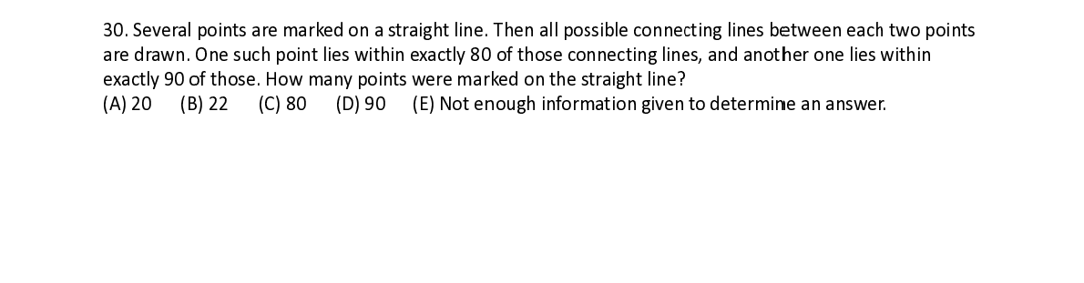 Q30. Several points are m m arked on a s s traight line. Then all po s s sible conne c c ting lines b e e tween eac h h two points are drawn. O One such p o o int lies with i i n exactly 8 0 0 of those co n necting lin e e s, and anot h h er one lies w w ithin exactly 90 o o f those. Ho w w many poin ts were mar r ked on the s s traight line?