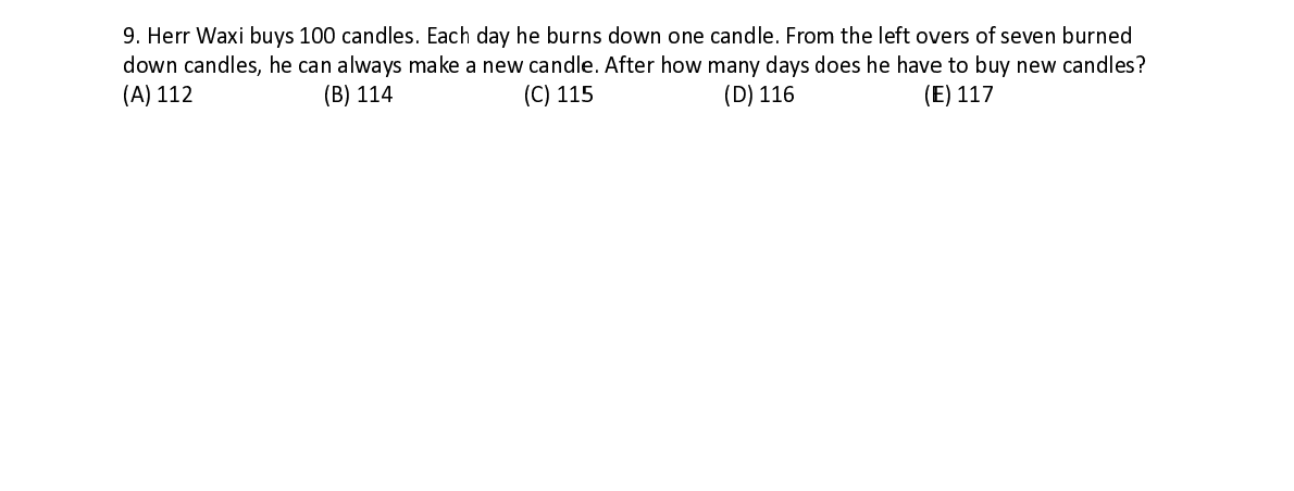 Q9. Herr Wa x x i buys 100 c andles. Eac h h day he bur n n s down on e e candle. Fro m the left o v v ers of seve n n burned down candl es, he can a l l ways make a a new candl e e . After how many days d d oes he hav e e to buy ne w w candles?