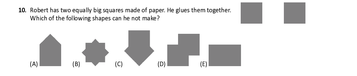 Q10. Robert has two equally big squares made of paper . He glues them together . W hich of the following shapes can he not make ?
