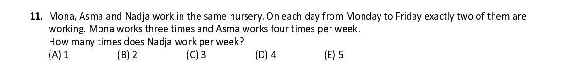 Q11. Mona, Asma a nd Nadja work in the same nursery . On each day from Monday to Friday exactly two of them are working. Mona works three times and Asma works four times per week . How many times does Nadja work per week ?