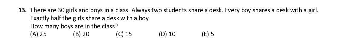 Q13. T here are 30 girls and boys i n a class . Always two students share a desk . Every boy shares a desk with a girl. Exactly half the girls share a desk with a boy . How many boys are in the class ?