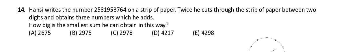 Q14. Hansi writes the number 2581953764 on a strip of paper . Twice he cuts through the strip of paper between two digits and obtains three number s which he adds . How big is the smallest sum he can obtain in this way ?