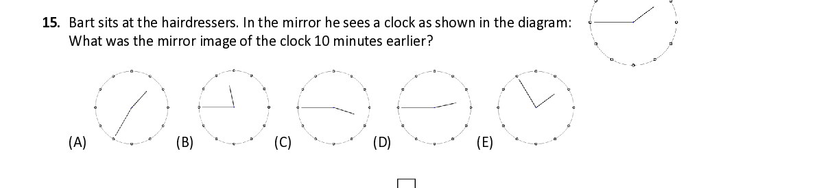 Q15. Bart sit s at the hairdressers . In the mirror he sees a clock as shown in the diagram : W hat was the mirror image of the clock 10 minutes earlier ?