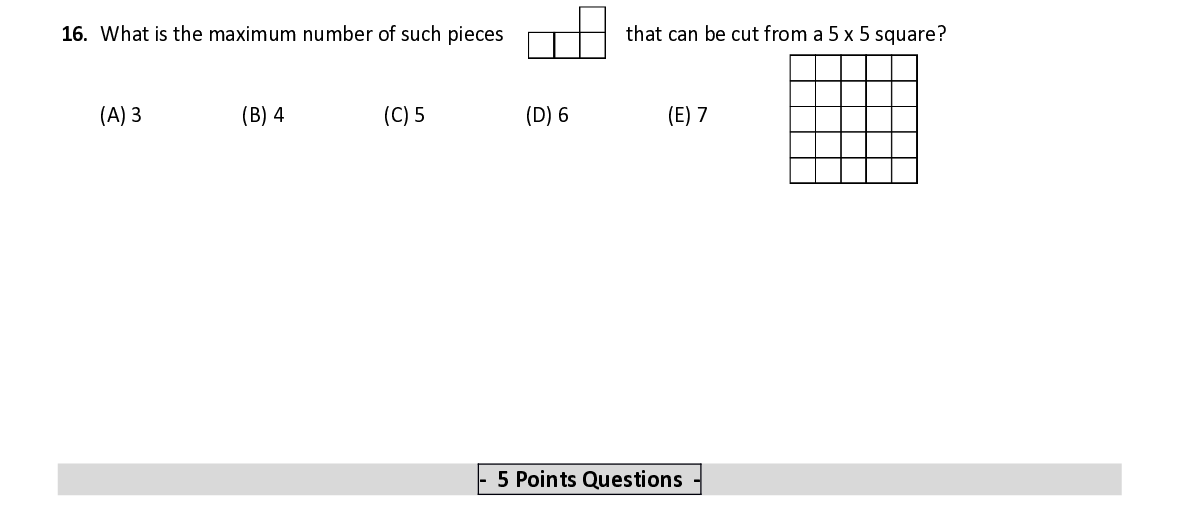 Q16. W hat is the maximum number of such pieces that can be cut from a 5 x 5 square ?