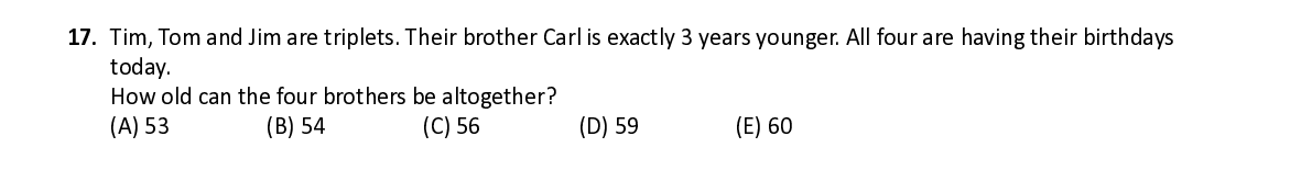 Q17. Tim, Tom a nd Jim are triplets . Their brother Carl is exactly 3 years younger . All four are having thei r b i r thdays today . How old can the four brothers be altogether ?