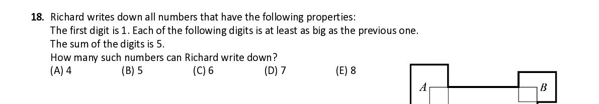 Q18. Richard writes down all numbers that have the following properties : The first digit is 1. Each of the follow i n g digits is at least as big as the previous one . The sum of the digits is 5. How many such numbers can Richard write down ?