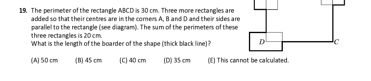 Q19. The p e r imeter of the rectangle ABCD is 30 cm. Three more rectangles are added so tha t their centres are in the corners A, B a nd D and their sides are parallel to the rectangle (see diagram ). The sum of the perimeters of these three rectangles is 20 cm. W hat is the length of the boarder of the shape ( thick black line )?