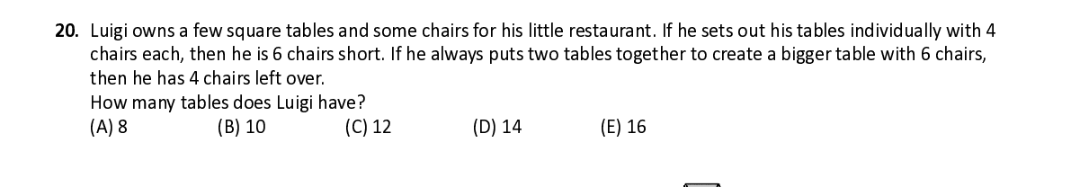 Q20. Luigi owns a few square tables and some chairs for his little restaurant . If he sets out his tables individually with 4 chairs each, then he is 6 chairs short. If he always puts two tables toge ther to create a bigger table with 6 chairs, then he has 4 chairs left over. How many tables does Luigi have ?