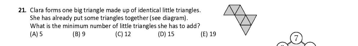 Q21. Clara forms one big triangle made up of identical little triangles . S he has already put some triangles together (see diagram ). What is the minimum number of little triangles she has to add ?