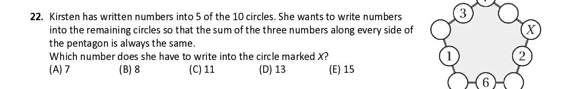 Q22. Kirsten ha s written numbers into 5 of the 10 circles . She wants to write numbers into the remaining circles so that the sum of the three numbers along every side of the pentagon is always the same . W hich number does she have to write into the circle marked X ?