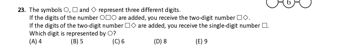 Q23. The s ymbo l s , a nd represent three different digits . If the digits of the number a re a dde d , you receive the two - digit number . If the digits of the two - digit number a re a dde d , you receive the single - digit number . W hich digit is represented by ?