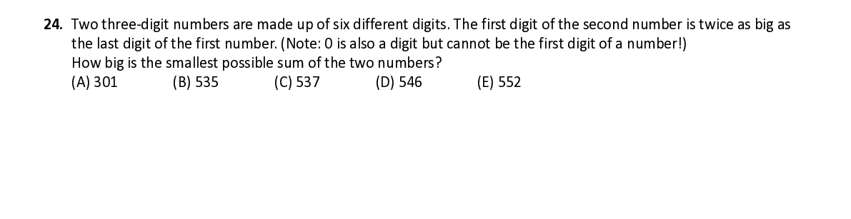 Q24. Two three - digit numbers are made up of six different digits. The first digit of the second number is twice as big as the last digit of the first number . ( Note : 0 is also a digit but cannot be the first digit of a number !) How big is the smallest possible sum of the two numbers ?