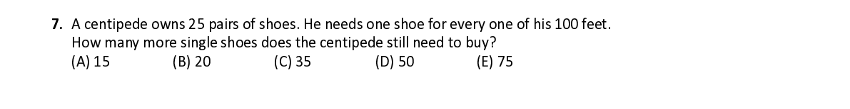 Q7. A centipede owns 25 pairs of shoes . He needs one shoe for every one of his 100 feet . How many more single shoes does the centipede still need to buy ?