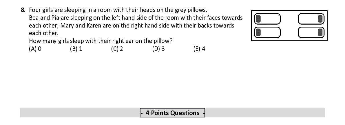 Q8. Four girls are sleeping in a room with their heads on the grey pillows . Bea a nd Pia are sleeping on the left hand side of the room with their faces towards each other ; Mary a nd Karen are on the right hand side with their backs towards each other . How many girls sleep with their right ear on the pillow ?