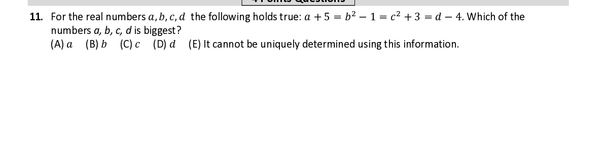 Q11. F or the real numbers 푎 , 푏 , 푐 , 푑 the following holds true: 푎 + 5 = 푏 − 1 = 푐 + 3 = 푑 − 4 . Which of the numbers a, b, c, d is biggest ?