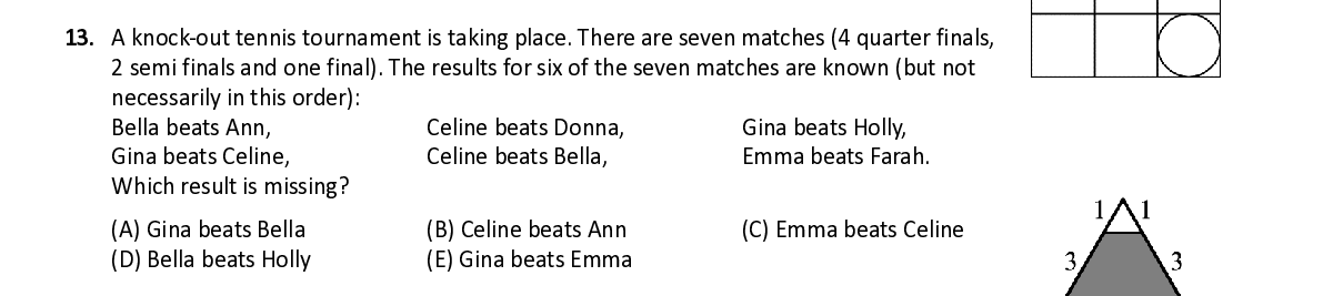 Q2. semi finals a nd one f inal ). The results for s ix of the seven matches are known ( but not necessarily in this order ): Bella beats Ann, Celine beats Donna, Gina beats Holly, Gina beats Celine, Celine beats Bella, Emma beats Farah. Which result is missing ?