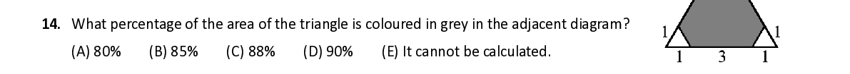 Q14. W hat percentage of the area of the triangle is coloured in grey in the adjacent diagram ?