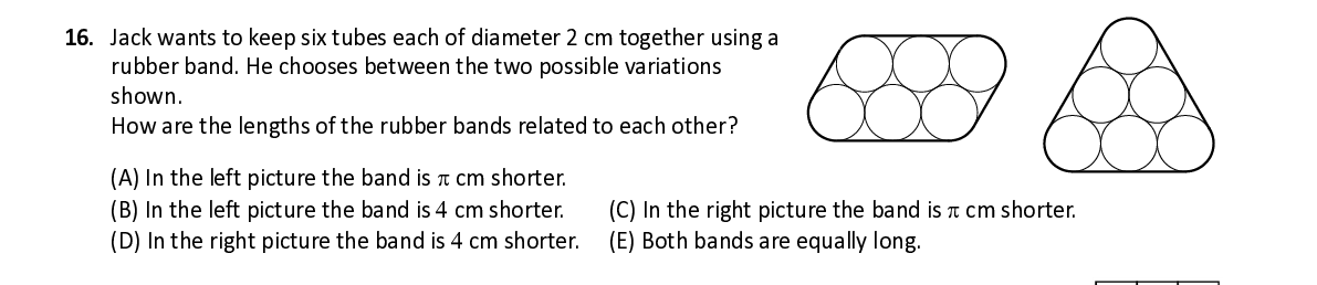 Q16. Jack wants to keep six tubes each of diameter 2 cm together using a rubber band. He chooses between the two possible variat ions shown . How are the lengths of the rubber bands related to each other ?