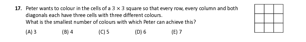 Q17. Peter wants to colour in the cells of a 3 × 3 square so that every row, every column and both diagonals each have three cells with three different colours . W hat is the smallest number of colours with which Peter can achieve this ?