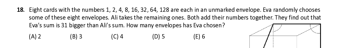 Q18. Eight cards with the numbers 1, 2, 4, 8, 16, 32, 64, 128 are each in an unmarked envelop e . Eva randomly chooses some of these eight envelopes. Ali takes the remaining ones . Both add their numbers together . They find out that Eva ’ s sum is 31 bigger tha n Ali ’ s sum . How many envelopes has Eva chosen ?