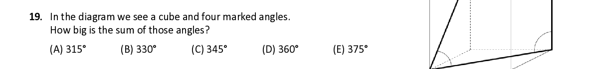Q19. I n the diagram we see a cube and four marked angles . How big is the sum of those angles ?