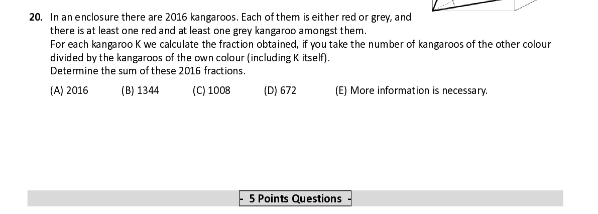 Q20. In an enclosure there are 2016 kangaroos . Each of them is either red or grey, and there is at least one red and at least one grey kangaroo amongst them . F or each kangaroo K w e calculate the fraction obtained , if you take the number of kangaroos of the other colour divided by the kangaroos of the own colour (including K itself) . Determine the sum of these 2016 fractions .