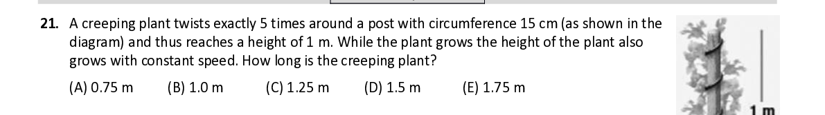 Q21. A creeping plant twists exactly 5 times around a post with circumference 15 cm (as shown in the diagram) and thus reaches a height of 1 m. While the plant grows the height of the plant also grows with constant speed . How long is the creeping plant ?