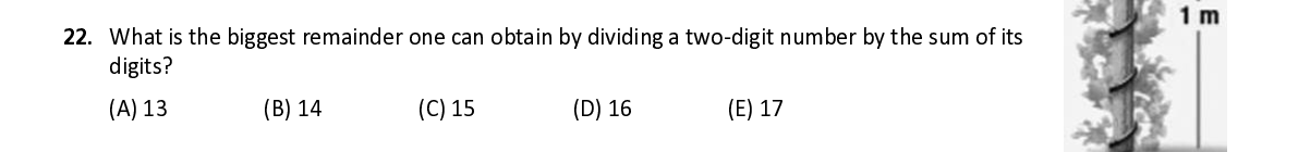 Q22. W hat is the biggest remainder one can obtain by dividing a two - digit number by the sum of its digits ?