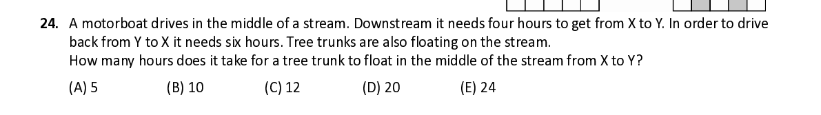 Q24. A motorboat drives in the middle of a stream. Downstream it needs four hours to get from X to Y. In order to drive back from Y to X it needs six hours. T ree trunks are also floating o n the stream. How many hours does it take for a tree trunk to float in the middle of the stream from X to Y ?