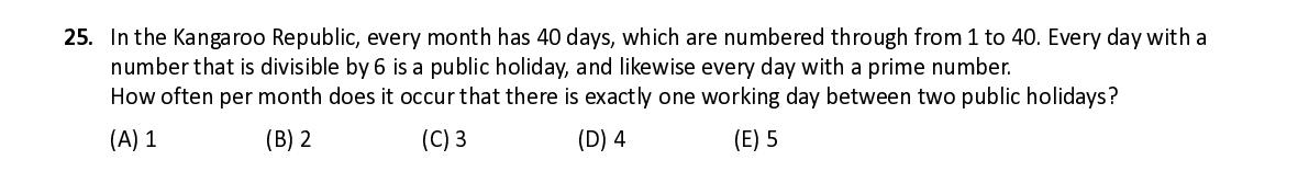Q25. In th e Kangaroo Republic , every month has 40 days, which are numbered through from 1 to 40. Every day with a number that is divisible by 6 is a publi c holiday, and likewise every day with a prime number. How often per month does it occur that there is exactly one working day between two public holidays ?
