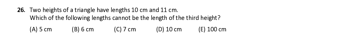 Q26. Two heights of a triangle have lengths 10 cm a nd 11 cm. W hich of the following lengths cannot be the length of the third height ?