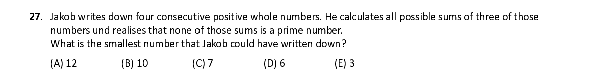 Q27. Jakob writes down four consecutive positive whole numbers. He calcula tes all possible sums of three of those numbers und realises that none of those sums is a prime number. W hat is the smallest number that Jakob could have written down ?