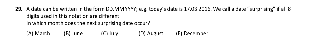Q29. A date can be written in the form DD.MM.YYYY ; e .g. today ’ s date is 17. 03.2016. We call a date “ surprising ” if all 8 digits used in this notation are different. In which month does the next surprising date occur ?