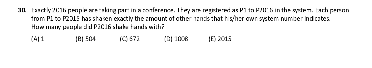 Q30. Exactly 2016 people are taking part in a conference. They are registered as P1 to P2016 in the system. Each person from P1 to P2015 has shaken exactly the amount of other hands that his/her own system number indicates. How many people did P2016 sha k e hands with ?