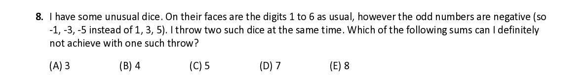 Q8. I have some unusual dice . On their faces are the digits 1 to 6 as usual, however the odd numbers are negative ( so - 1, - 3, - 5 instead of 1, 3, 5). I throw two such dice at the same time . W hich of the following sums can I definitely not achieve with one such throw ?