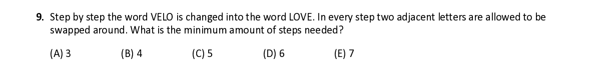Q9. S tep by step the word VELO is changed int o the word LOVE . In every step two adjacent letters are allowed to be swapped around . What is the minimum amount of steps needed ?