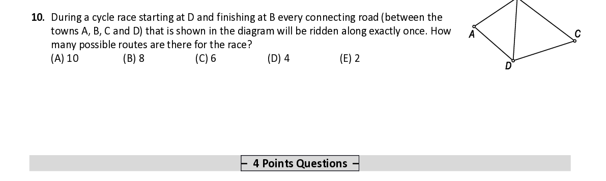 Q10. During a cycle race starting at D and finishing at B every connecting road (between the towns A, B, C and