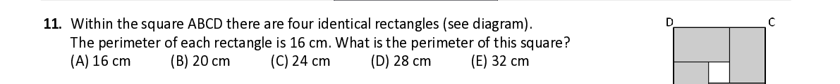 Q11. Within the square ABCD there are four identical rectangle s (see diagram). The perimeter of each rectangle is 16 cm. What is the perimeter of this square ?