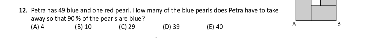 Q12. Petra ha s 49 blue a nd one red pea rl. How many of the blue pearl s does Petra have to take away so that 90 % of the pearls are blue ?