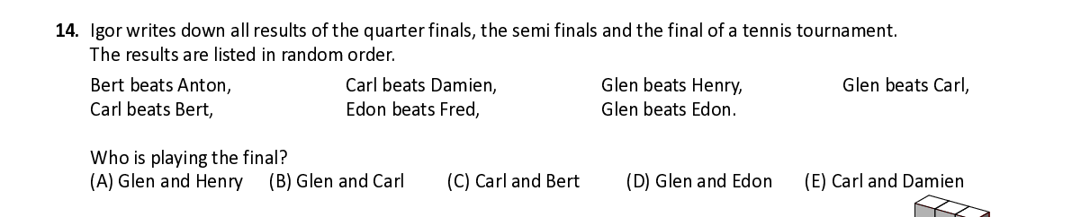 Q14. Igor writes down all results of the quarter finals, the semi finals and the final of a tennis tournament. The results are listed in random order . Bert beats Anton, Carl beats Damien, Glen beats Henry, Glen beats Carl, Carl beats Bert, Edon beats Fred, Glen beats Edon. W ho is playing th e final ?