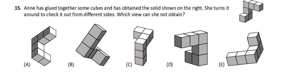 Q15. Anne ha s glued together some cubes and has obtained the solid shown on the right. She turns it around to check it out from different sides. Which view can she not obtain ?