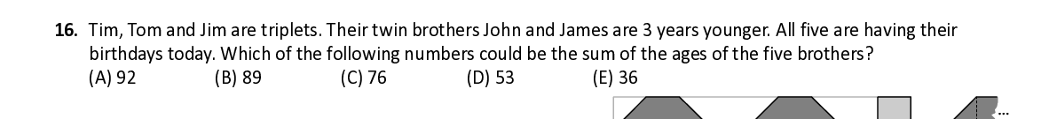 Q16. Tim, Tom a nd Jim are triplets . Their twin brothers John a nd James are 3 years younger . All five are having their birthday s today. Which of the following numbers could be the sum of the ages of the five brothers ?