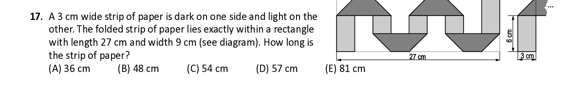 Q17. A 3 cm wide strip of paper is dark on one side and light on the other . The folded strip of paper lies exactly within a rectangle with length 27 cm a nd width 9 cm (see diagram ). How long is the strip of paper ?