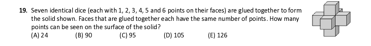 Q19. S even identical dice ( each with 1, 2, 3, 4, 5 a nd 6 points on their faces ) are glued together to form the solid shown . Faces that are glued together each have the same number of points . How many points can be seen on the surface of the solid ?