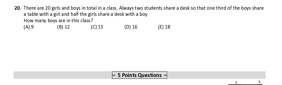 Q20. There are 20 girls and boys in total in a class . Always two students share a desk so that one third of the boys share a table with a girl and half the girls share a desk with a boy. How many boys are in this class ?