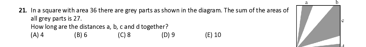 Q21. In a square with area 36 there are grey parts as shown in the diagram . The sum of the areas of all grey parts is 27 . How long are the distances a, b, c a nd d together ?