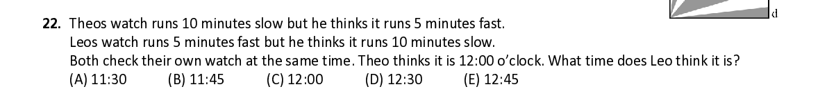 Q22. Theos watch runs 10 minutes slow but he thinks it runs 5 minutes fast. Leos watch runs 5 minutes fast but he thinks it runs 10 minutes slow . Both check their own watch at the same time . Theo thinks it is 12:00 o ’ clock . What time does Leo think it is ?