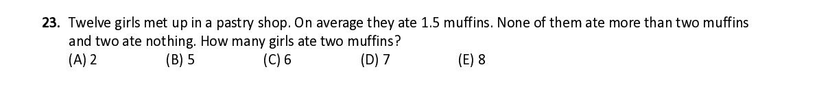 Q23. Twelve girls met up in a pastry shop . On average they ate 1. 5 m uffins. None of them ate more than two muffins and two ate nothing. How many girls ate two muffins ?